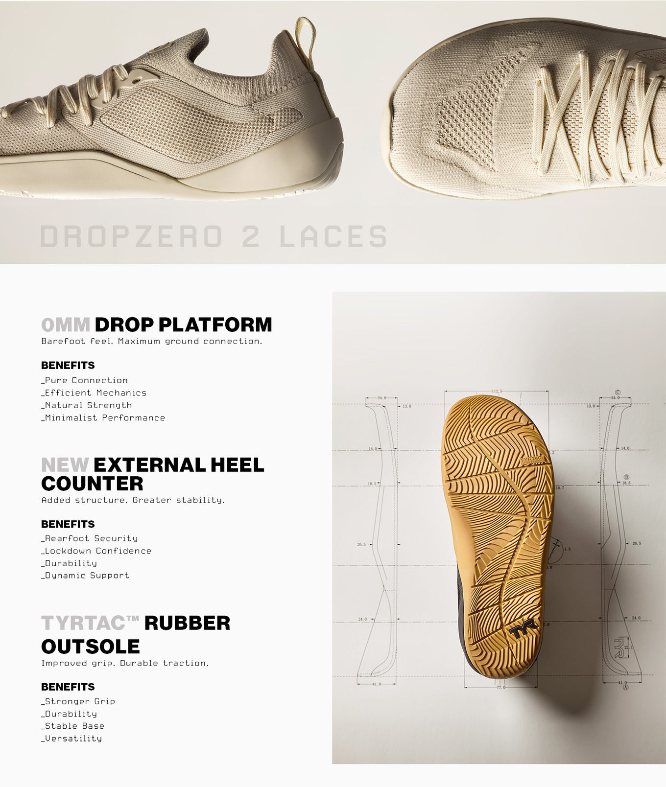 The DropZero Lace Barefoot Trainer enhances stability and control from the ground up. A 0mm heel, TYRTac™ traction system, and adjustable midfoot straps create a locked-in feel for lifting, balance, and agility.